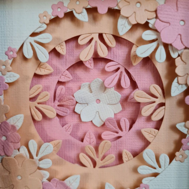 Handcrafted and totally unique, this black 12.5cm x 12.5cm x 3cm shadow box frame contains a 9cm x 9cm layered 3D floral circle design decorated with flowers and leaves in shades of peach. The frame has a perspex front making the frame safer and lighter than it would be with glass. The frame is deep enough to allow the frame to be freestanding, but also has a stand and a hanging loop.