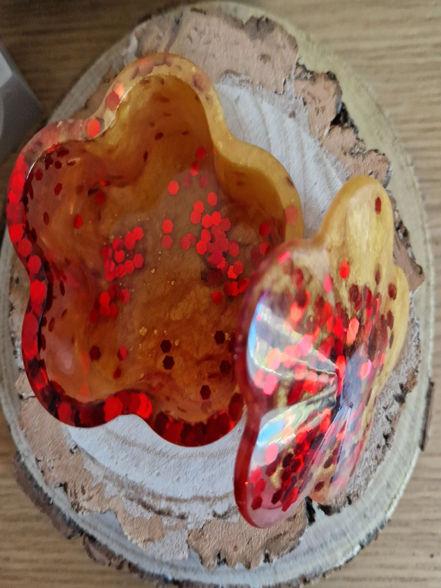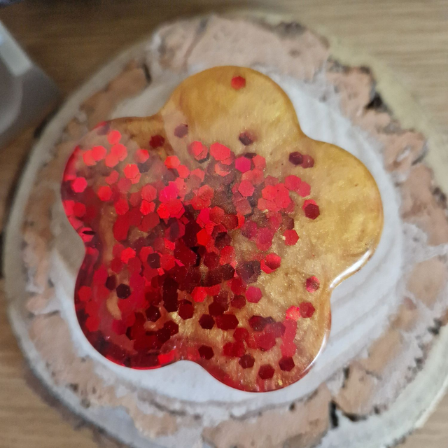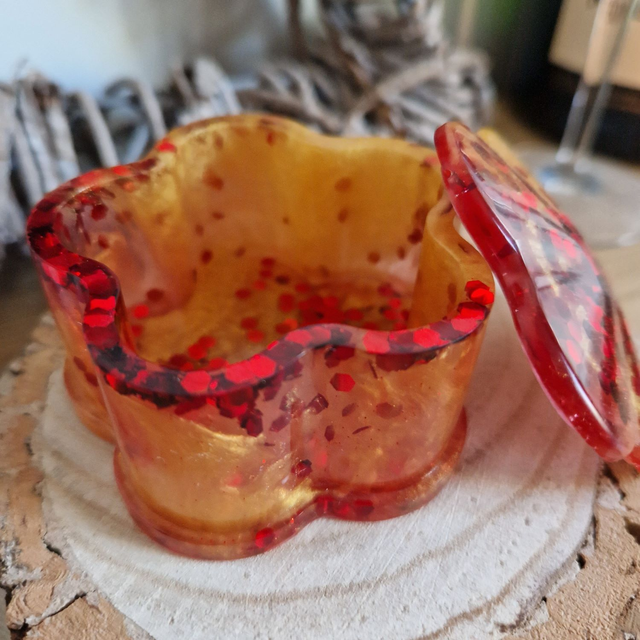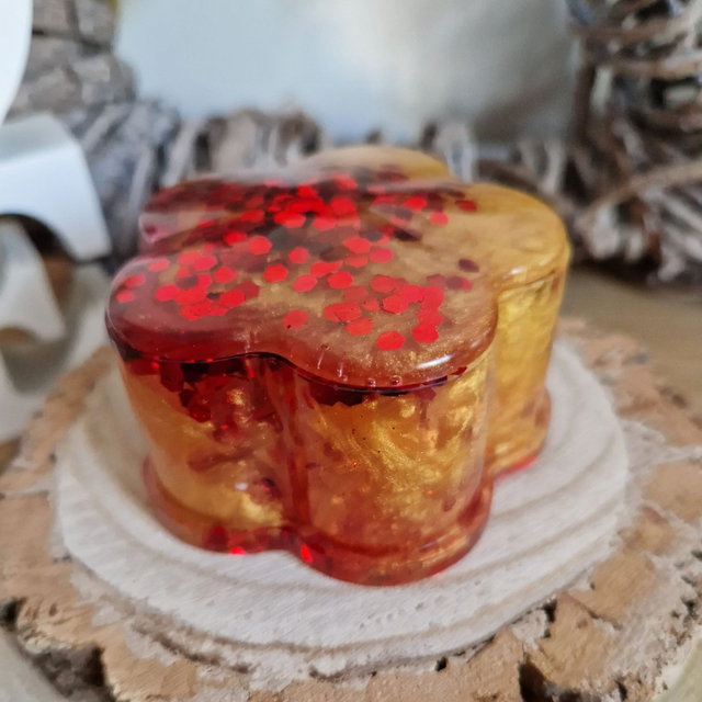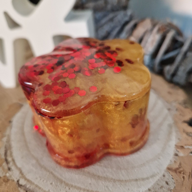 Sparkly flower shaped trinket box with lid made with gold and red resin.