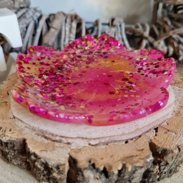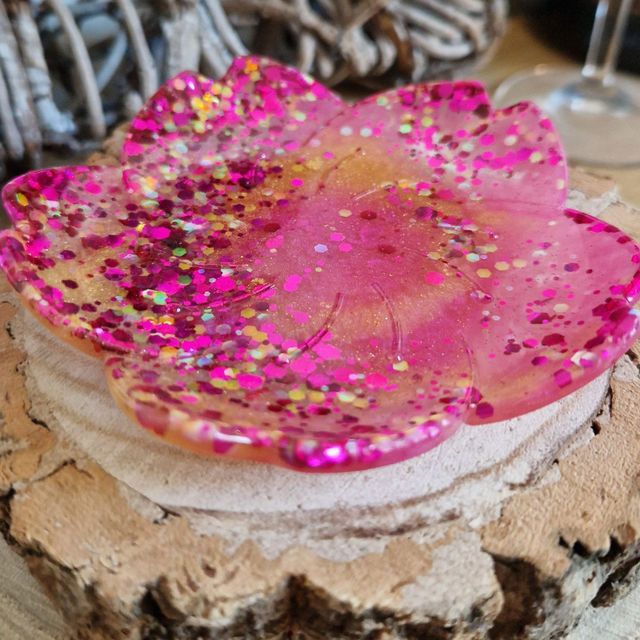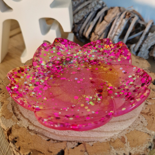 Sparkly flower shaped trinket tray made with gold, pink and glittery clear resin.