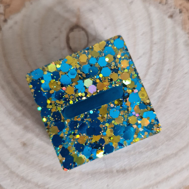 This is a single slot resin ring holder in turquoise and gold.