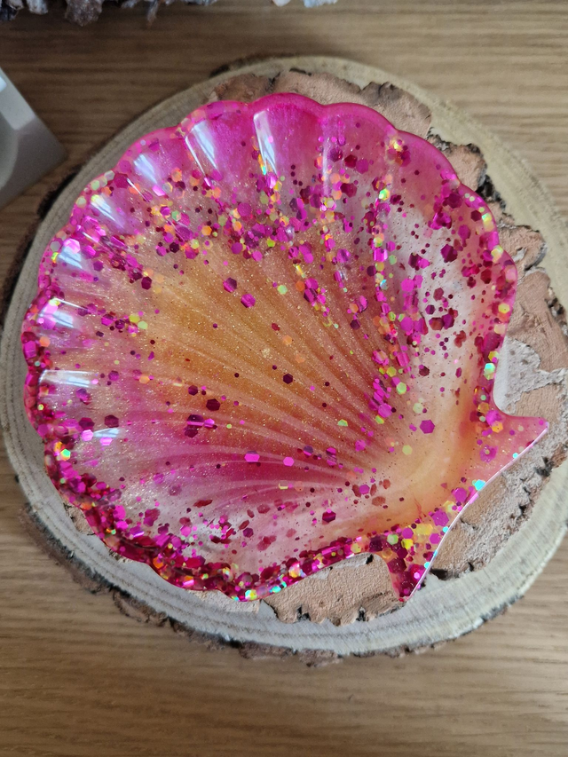 Sparkly shell shaped trinket tray made with gold, pink and glittery clear resin.