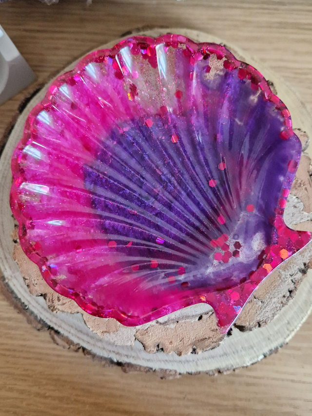 Sparkly shell shaped trinket tray made with purple, pink and glittery clear resin.